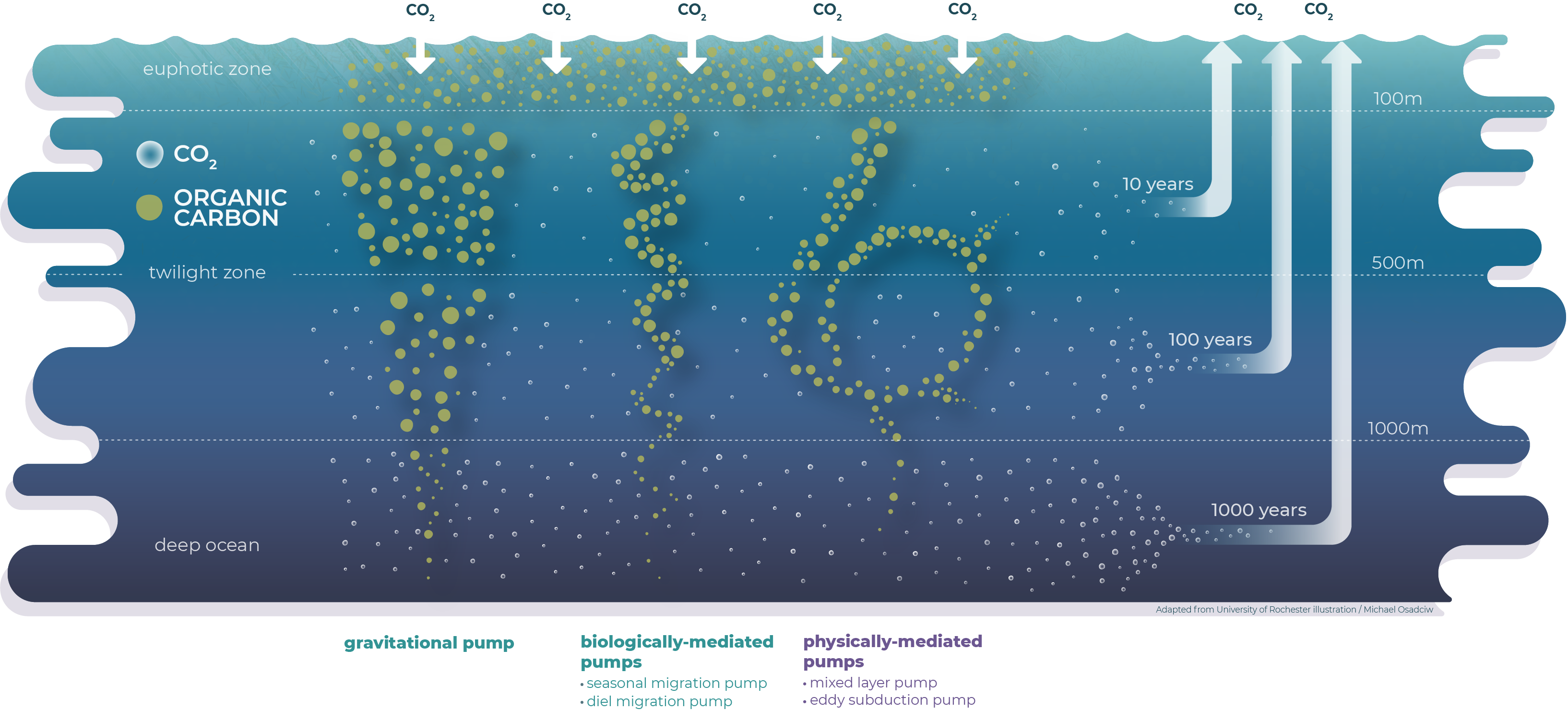 The times indicated in this figure (10, 100 and 1000 years) can be understood as average residence times of carbon in the water column. Indeed, it is shown in our study that some fraction of the carbon exported by the three pathways can be sequestered at all depths throughout the water column, this fraction increasing with depth (see next section).